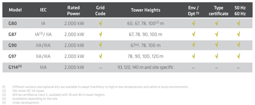As an example case study, let’s look at the turbine selection for Wigton III, which was commissioned in 2016 as the third phase of the Wigton wind farm. It consists of twelve (12) Gamesa G80 wind turbines and it is located at Rose Hill, Manchester, Jamaica. The G80 turbine formed part of Gamesa’s 2.0 MW platform, as shown in the table below and it has an IEC IA class rating.
