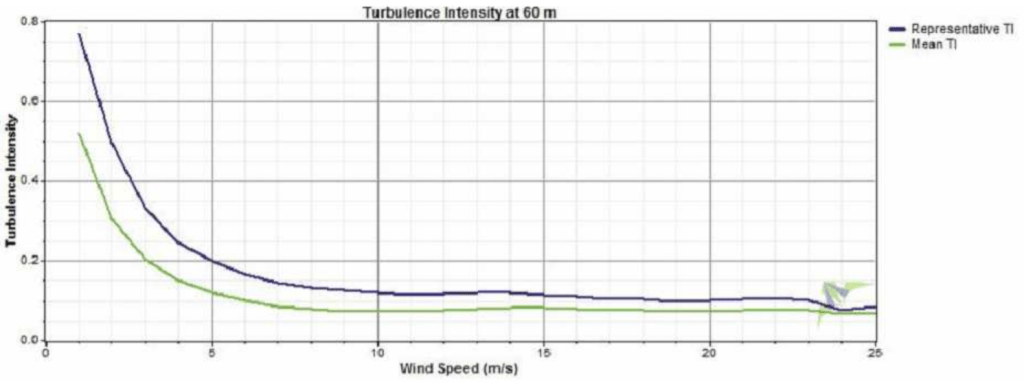 The next figure shows the turbulence intensity versus wind speed of up to 25 m/s. We can see that the mean and representative turbulence intensities are approximately 0.08 and 0.12 at 15 m/s, respectively. This implies that a turbine rated for low turbulence intensity (i.e with mean turbulence intensity of 0.12) is adequate for this site. However, this turbulence intensity represents the case of an isolated wind turbine, but consideration must also be given to the turbulence resulting from the wake of other turbines installed on the wind site. This in addition to the proven options available from Gamesa, at the time, meant that only the G80 turbine would have met the wind speed class and hence Wigton’s selection.