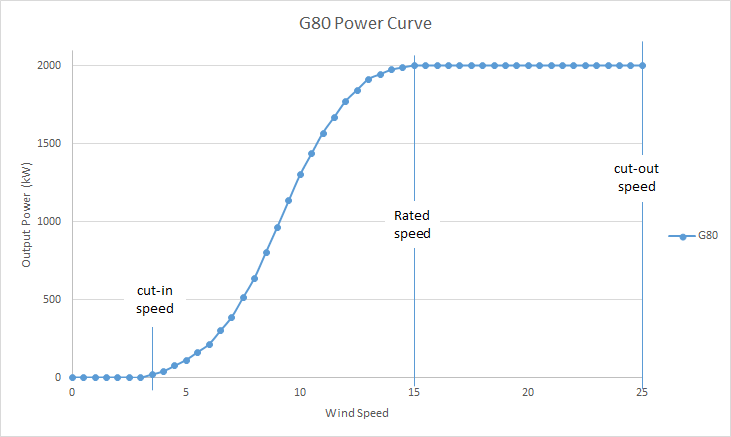 Once the optimal turbine has been selected for a particular wind site, the annual energy production (and capacity factor) can be estimated from the wind speed distribution of the site and the selected wind turbine power curve. For example, the power curve for the G80 is shown below. It has cut-in, rated and cut-out wind speeds of 3.5, 15, 25 m/s, respectively.