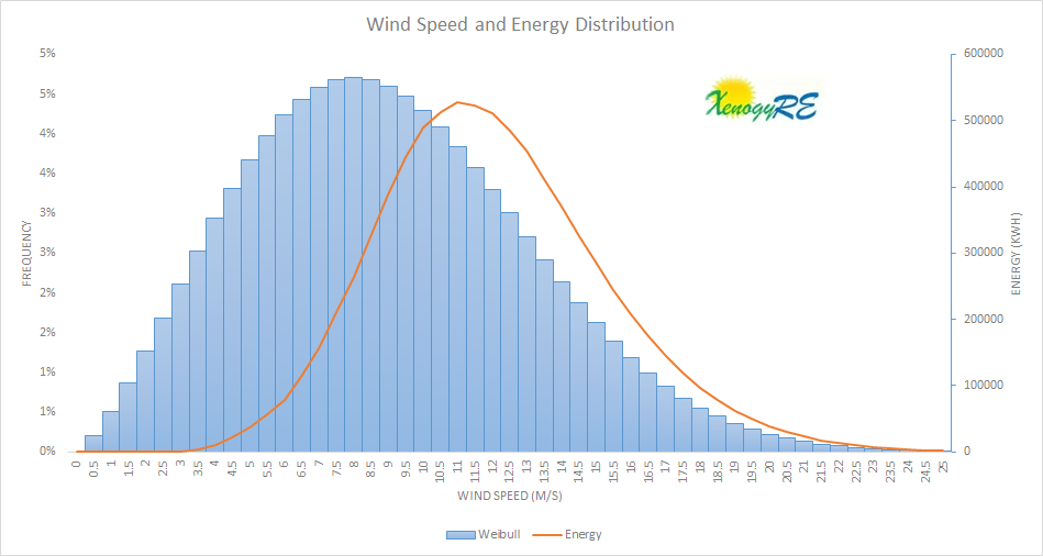 The wind speed distribution of the Rose Hill site is illustrated in the figure below using a Weibull distribution with c and k factors of 10.18 m/s and 2.43, respectively. The figure also shows the estimated energy production of the G80 turbine over its operating speed range in an average year, with peak energy production at 11 m/s wind speed. The aggregate energy is therefore estimated to be approximately 835,000 kWh per annum, which corresponds to a capacity factor of 48% or 4205 full-load hours per annum. This estimated annual energy production and capacity factor are, however, considered to be gross or theoretical as it ignores all the mechanical and electrical losses.