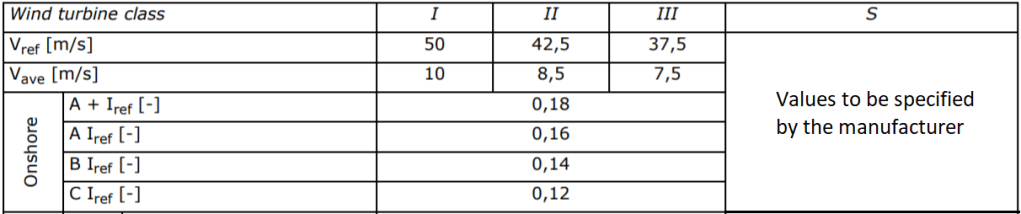 The roman numbers I, II and III represent turbines designed for high, medium and low wind speed sites, respectively. S is to be used by manufacturers for turbines that fall outside of the I, II and III classifications. The wind speed classification is primarily dependent on the reference wind speed (Vref), which is the extreme (maximum) 10-minute average (mean) wind speed expected, at the turbine hub height, with a recurrence period of 50 years. The average wind speed is derived from the reference speed as Vave = 0.2* Vref. The letters, on the other hand, define the reference turbulence intensity (Iref) at 15 m/s, where class A, B and C represents turbines designed for sites with high, medium and low turbulence characteristics, respectively. Turbulence is dependent on surface roughness, terrain, surface heat flux and the wake from nearby turbines.