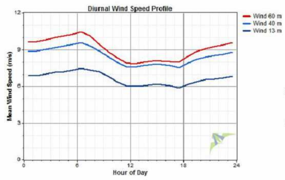 The figure below shows the mean diurnal wind speed profile at heights of 13, 40 and 60 meters (m) above ground. If we narrow in on the 60m profile, we will see that the diurnal wind speed varies between 6.90 to 10.88 meters per second (m/s) in an average day with a mean of 9.04 m/s and a standard deviation of 0.772 m/s. Given that the mean wind speed of the Rose Hill site is above the design values for the low (7.5 m/s) and medium (8.5 m/s) turbine wind speed classes, the optimum wind turbine for this site must be rated for high wind speed (i.e with a mean wind speed of up to10 m/s). This justifies Wigton’s selection of the G80 turbine, with its Class I rating.